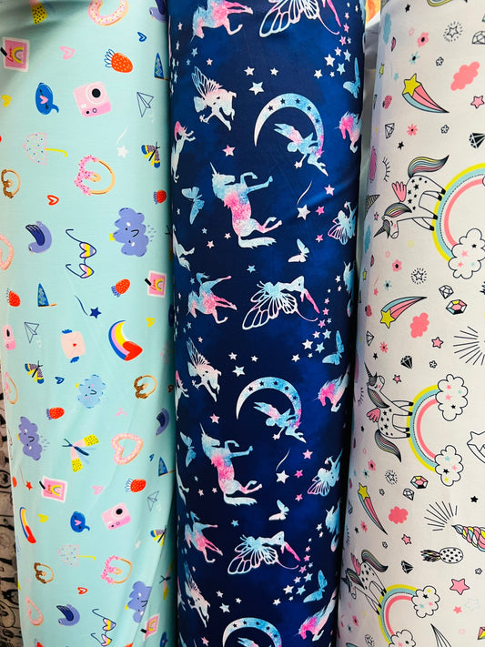 Multi Unicorn design & Multi print nylon spandex 4-way stretch 58/60” Sold by the YD. Ships Worldwide from Los Angeles California USA.
