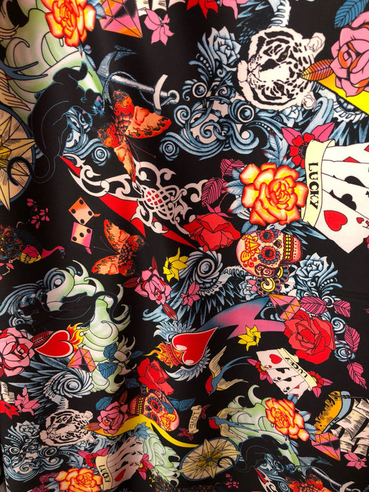 New vegas design on nylon spandex 4way Stretch 58/60" Sold by the YD. Ships worldwide from Los Angeles California USA.