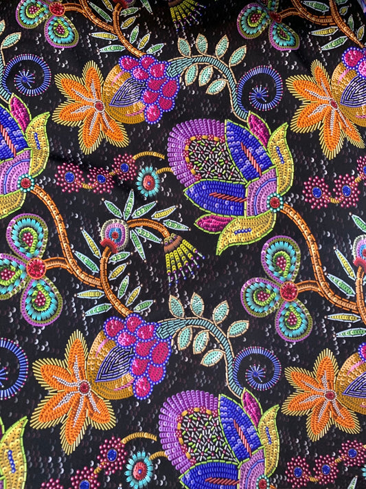 African design Black Multicolor print on nylon spandex 4-way stretch 58/60” Sold by the YD. Ships Worldwide from Los Angeles California USA.
