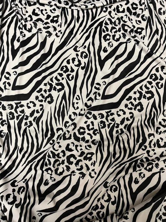 Exotic animal print white/black print on nylon spandex 4-way stretch 58/60” Sold by the YD. Ships Worldwide from Los Angeles California USA.