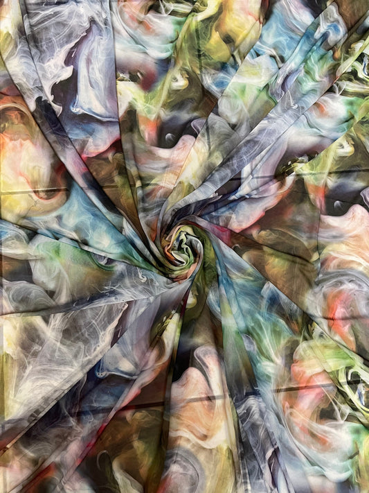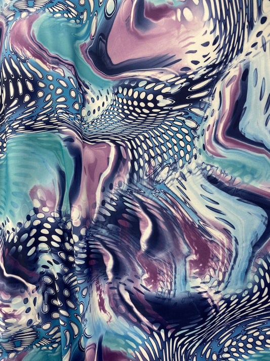New abstract design multicolor print on nylon spandex 4-way stretch 58/60” Sold by the YD. Ships worldwide from Los Angeles California USA.