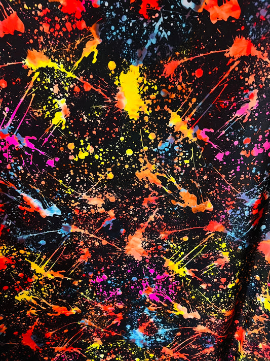 New splatter paint design Black/Multicolor print on nylon spandex 4-way stretch 58/60” Sold by the YD. Ships worldwide from Los Angeles Cali
