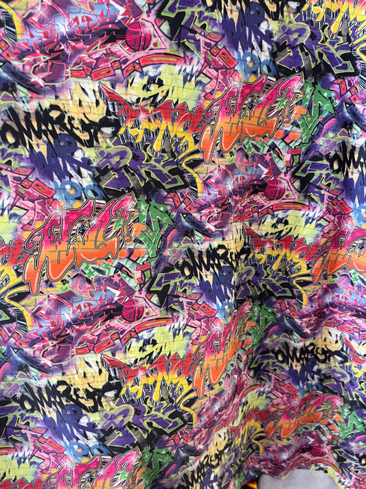 Graffiti design print on best quality of nylon spandex 4-way stretch 58/60” Sold by the YD. Ships Worldwide from Los Angeles California USA.