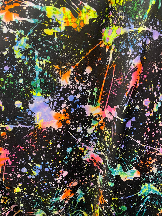 New splatter paint design print on nylon spandex 4-way stretch 58/60” Sold by the YD. Ships worldwide from Los Angeles California USA.