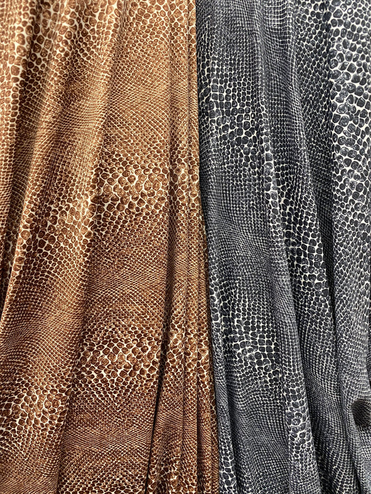 New exotic snake design print on nylon spandex 4-way stretch 58/60” Sold by the YD. Ships worldwide from Los Angeles California USA.