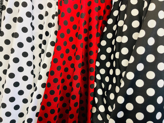 Polka dots design print on best quality of Nylon spandex 4-way stretch 58/60” Sold by the YD. Ships Worldwide from Los Angeles California US