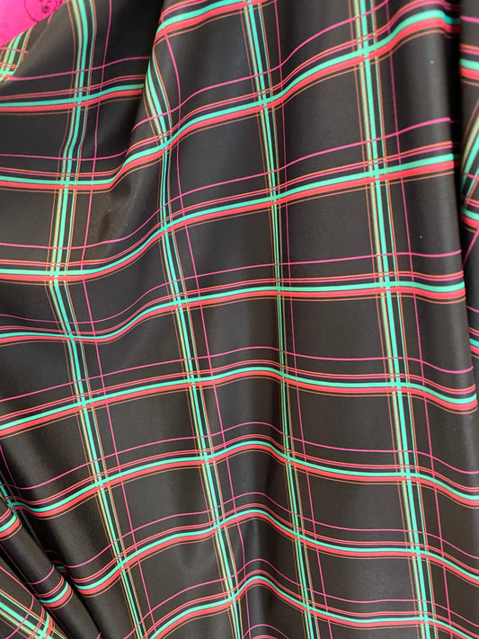 New plaid design black/multi print nylon spandex 4-way stretch 58/60” Sold by the YD. Ships worldwide from Los Angeles California USA.