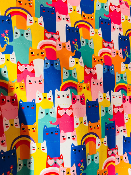 Kitty cat design multicolor print on great quality of Nylon spandex 4-way stretch 58/60” Sold by the YD. Ships worldwide from Los Angeles