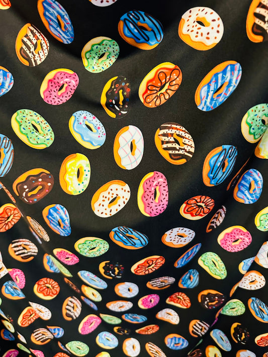 New donuts design Black multicolor print on great quality of nylon spandex 4way Stretch 58/60” Sold by the yd. Ships worldwide from L.A