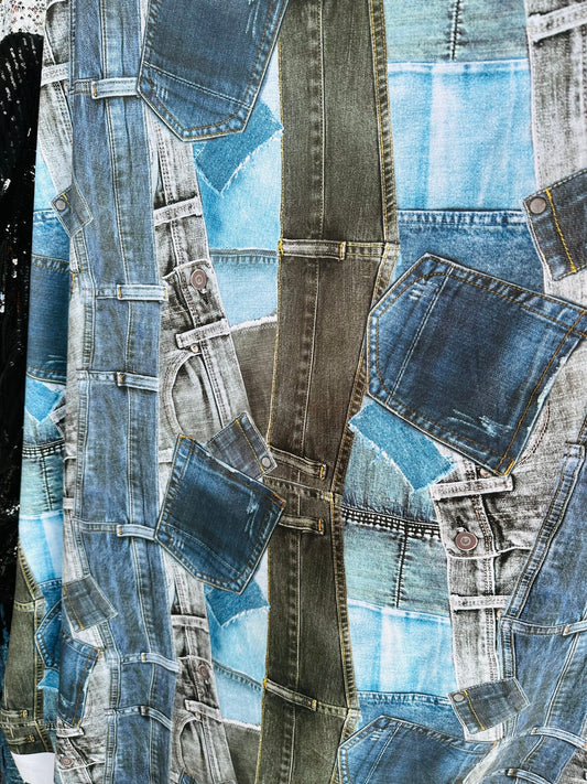 Luxury Jeans Pocket design print on great quality of nylon spandex 4-way stretch 58/60” Sold by the YD.