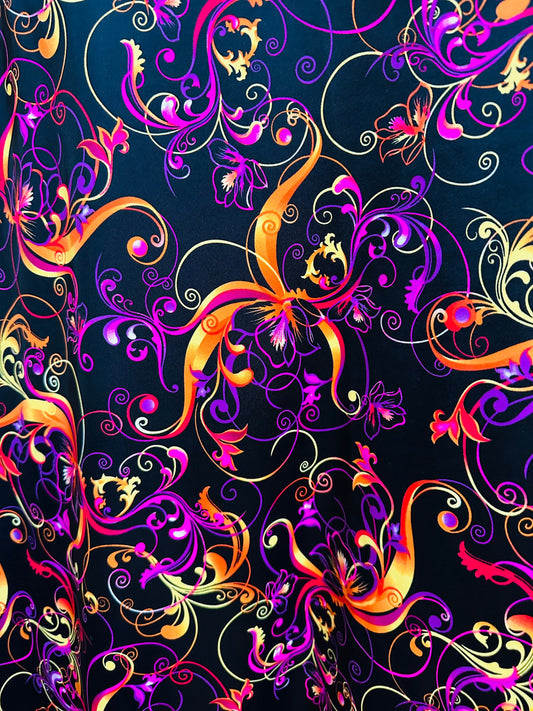 New Magic Flourish design Black/Multicolor Best quality of nylon spandex 4-way stretch 58/60” high quality spandex Sold by the YD.
