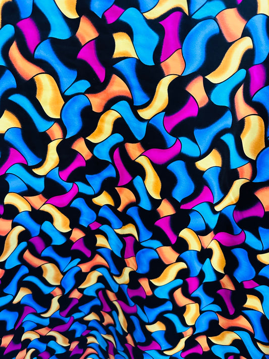 New Luxury Abstract design Multicolor print on great quality of nylon spandex 4-way stretch 58/60” Sold by the YD.