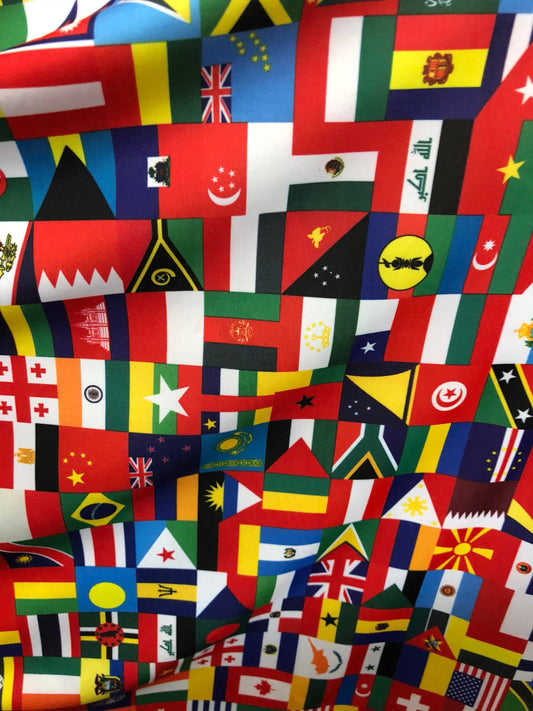New International multi flags design printed on nylon spandex 4way stretch 58/60" Sold by the YD. Ships worldwide from Los Angeles CA USA.