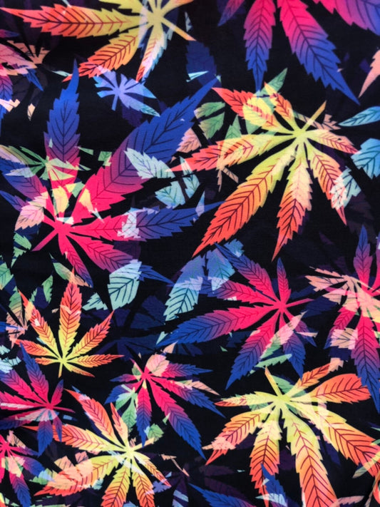 Marijuana cannabis leaf design print on nylon spandex 4way stretch 58/60" Sold by the YD. Ships worldwide from Los Angeles California USA.