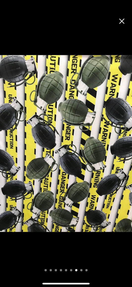 New Grenades caution danger print on nylon Spandex 4-way 58/60” Sold by the yard. Print just as shown in the pictures. Ships worldwide