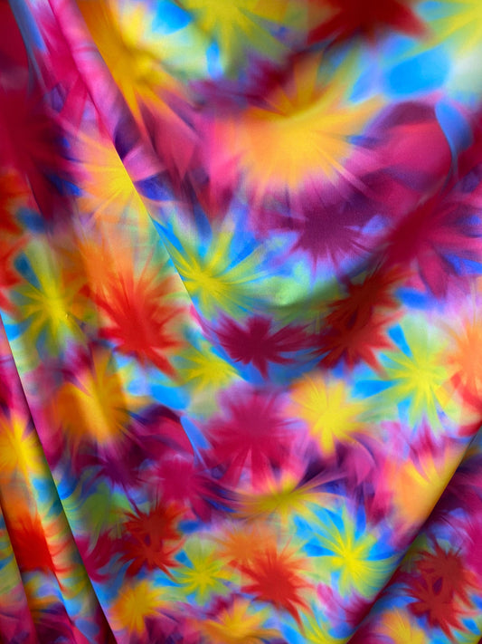 Great quality of tie dye nylon spandex star design 4-way stretch 58/60” Sold by the YD. Ships worldwide from Los Angeles California USA.