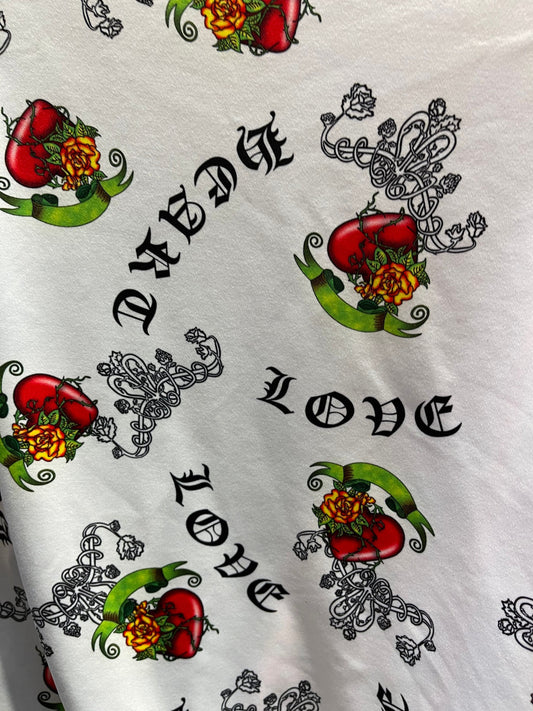 Great Love design print on poly spandex white/red 4-way stretch 58/60” Sold by the YD. Ships Worldwide from Los Angeles California USA.