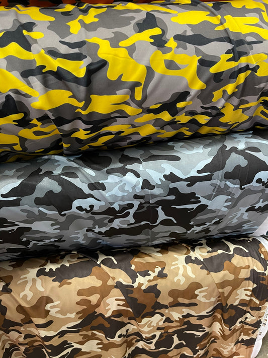 Camouflage design print on nylon spandex 4-way stretch 58/60” Sold by the YD. Ships Worldwide from Los Angeles California USA.