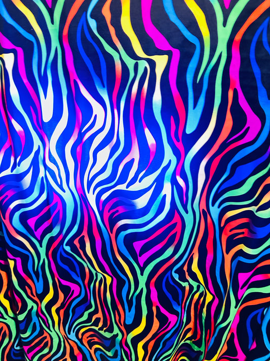 Exotic Zebra design rainbow nylon spandex 4-way stretch it glows under black light.