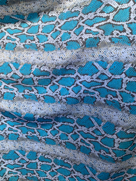New snake print white/blue/gray print on nylon spandex 4way stretch 58/60" Sold by the YD. Ships worldwide from Los Angeles California USA.