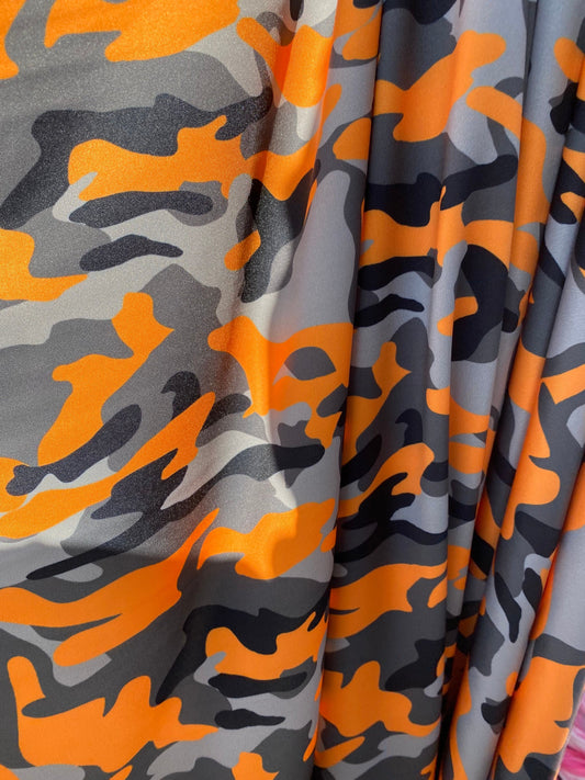New modern camouflage Orange/black/Gray print on great quality of nylon spandex 4-way stretch 58/60” Sold by the YD.