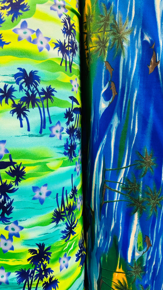 Hawaiian Tropical design Print on great quality of Brazilian nylon spandex 4-way stretch 58/60” High Quality fabrics by AlexLAFabrics