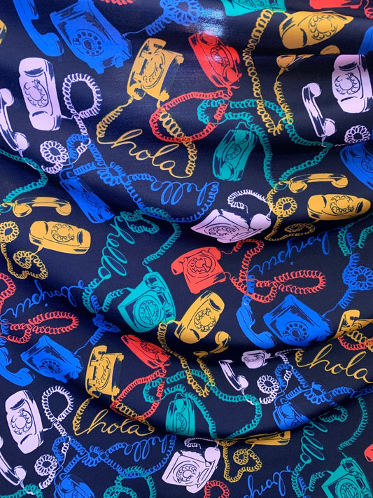 New telephone multicolor design print on nylon spandex 4way stretch 58/60" Sold by the YD. Ships worldwide from Los Angeles California USA.