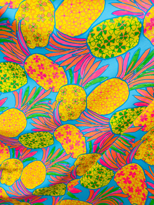 New Pineapple design tropical multicolor print on best quality of nylon spandex 4-way stretch 58/60” Sold by the YD. Ships Worldwide