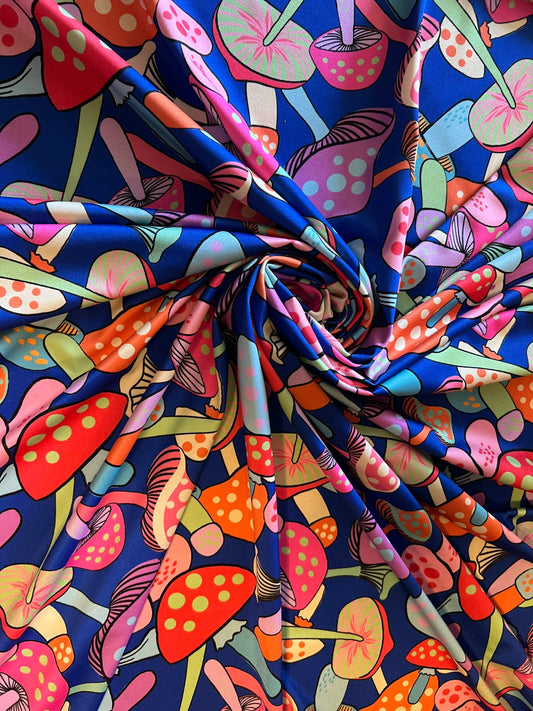 Mushrooms in wonderland design Sapphire/Multicolor print on best quality of nylon spandex 4-way stretch 58/60” Sold by the YD. Ships Worldwi