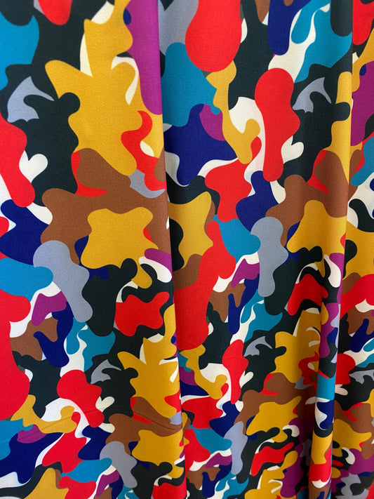 New camouflage multicolor print on nylon spandex 4-way stretch 58/60” Sold by the YD. Ships worldwide from Los Ángeles California USA.