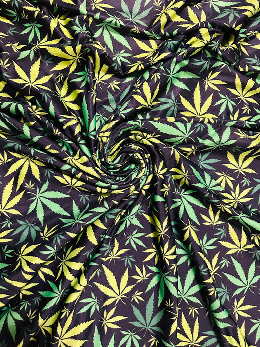 Marihuana leaf design Green/Yellow print on great quality of nylon spandex 4-way stretch 58/60” Sold by the YD. Ships worldwide from L.A