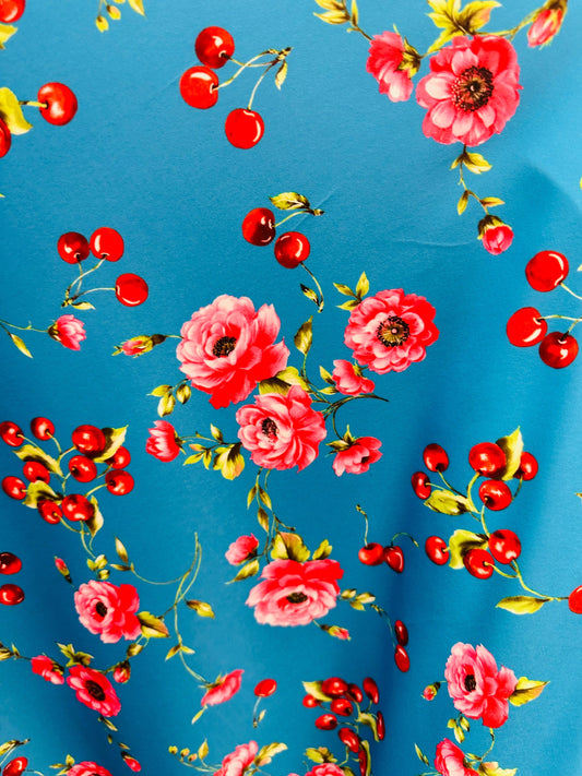Cherrys and Romantic flower design print on great quality of nylon spandex 4-way stretch 58/60” Sold by the YD. Ships worldwide from L.A