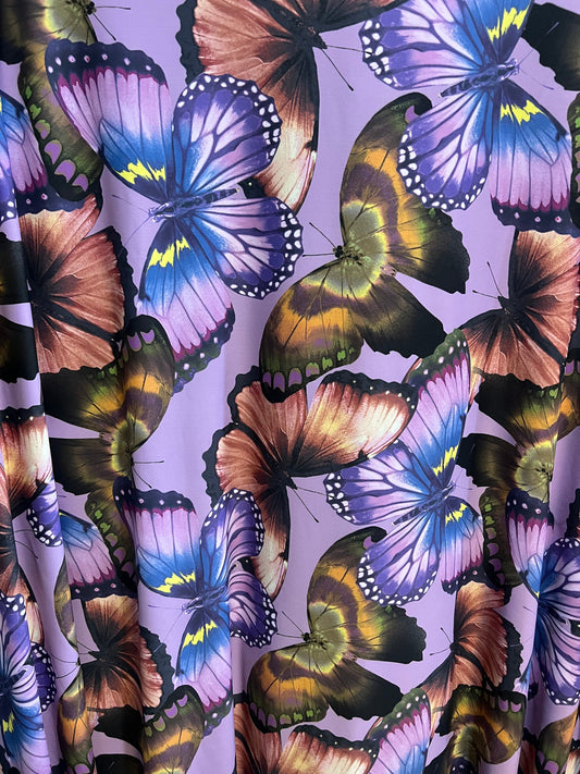 Exotic Butterfly design lavender/Multicolor print on great quality of nylon spandex 4-way stretch 58/60”