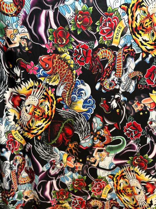 New Tattoo multi design print on nylon spandex 4-way stretch 58/60”