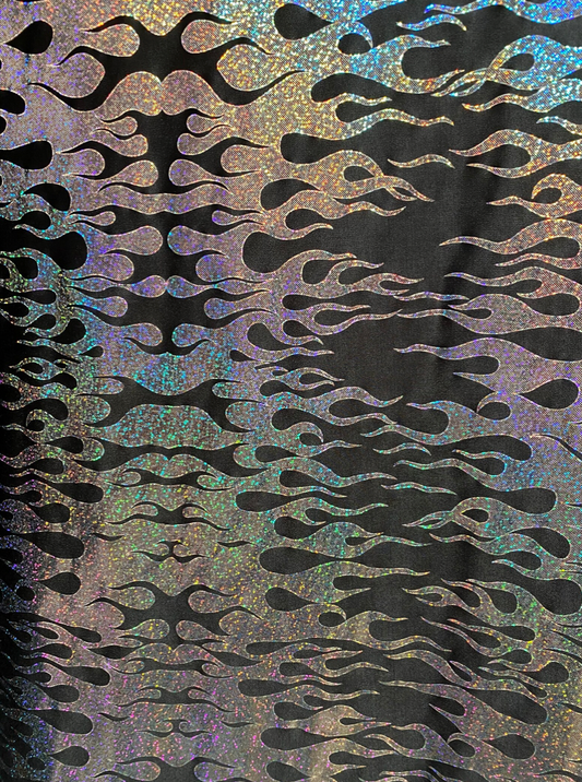 New hologram flames design metallic poly spandex black/silver 2-way stretch 58/60”