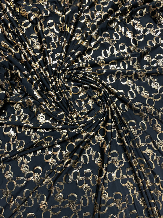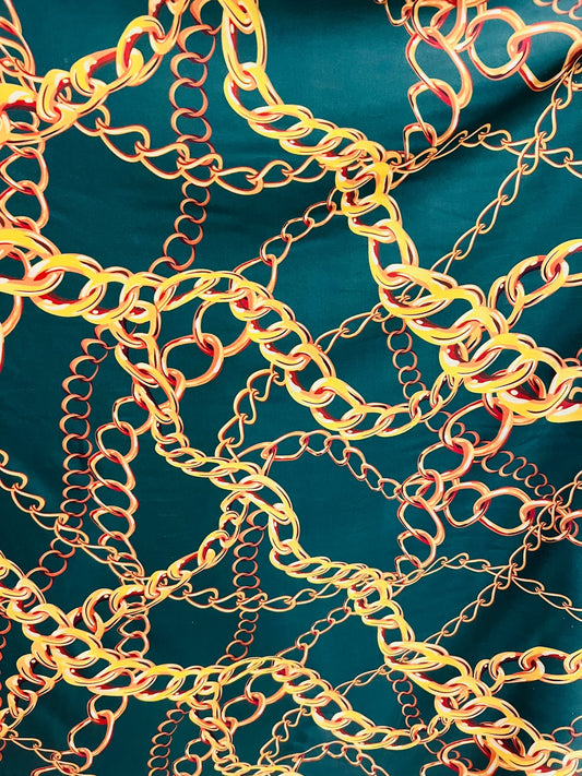 Gold chain design brand fashion style print on poly spandex 2-way stretch 58/60” Sold by the YD. Ships Worldwide from Los Angeles California