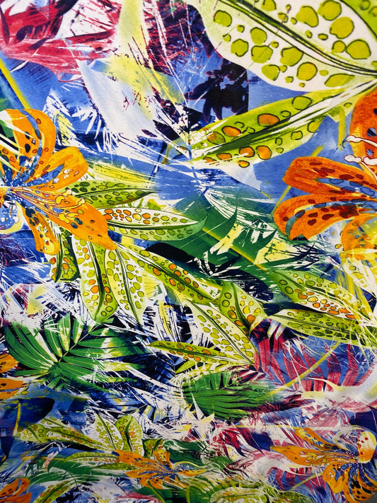 New print poly spandex tropical design 4-way Stretch 58/60” Sold by the YD. Ships worldwide from Los Angeles California USA.