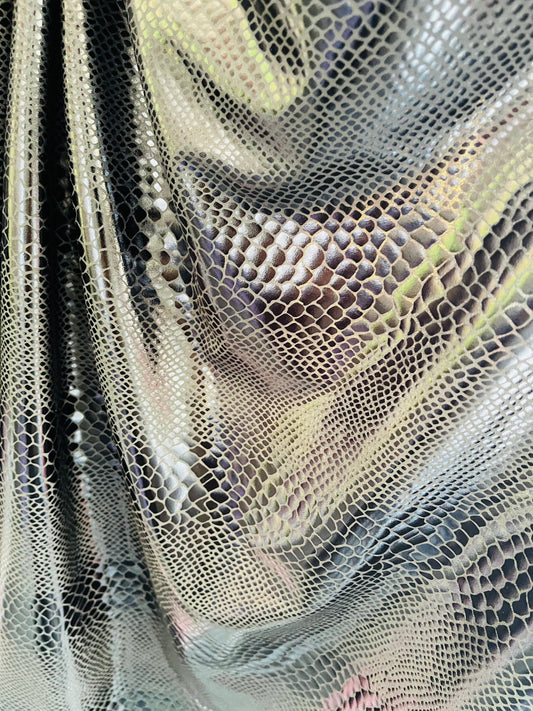 New snake design metallic Poly spandex 2-way stretch 58/60” Sold by the YD. Ships worldwide from Los Angeles California USA.