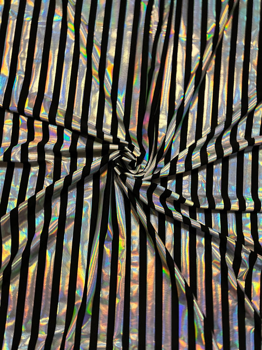 Metallic stripe design black/iridescent silver poly spandex 2-way stretch with lacer foil 58/60” Sold by the YD. Ships Worldwide from L.A CA