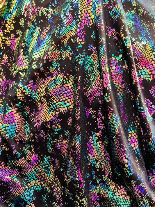 New Exotic snake design with clear foil print on poly spandex 2-way stretch Olive/Black/Taupe 58/60” Sold by the YD. Ships Worldwide