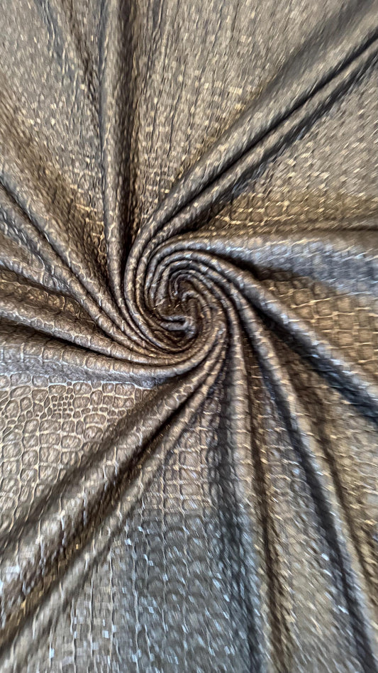 New Exotic Crocodile design embossed on poly spandex 2-way stretch 58/60” Sold by the YD. Ships Worldwide from Los Angeles California USA.