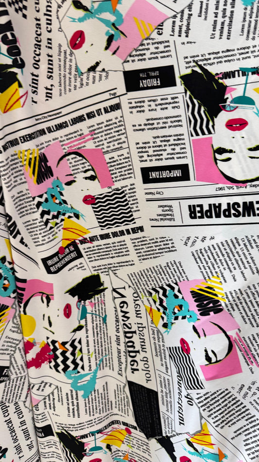 New Retro City Newspaper design print on poly spandex medium weight 2-way stretch 58/60” Sold by the YD. Ships worldwide from Los Angeles CA