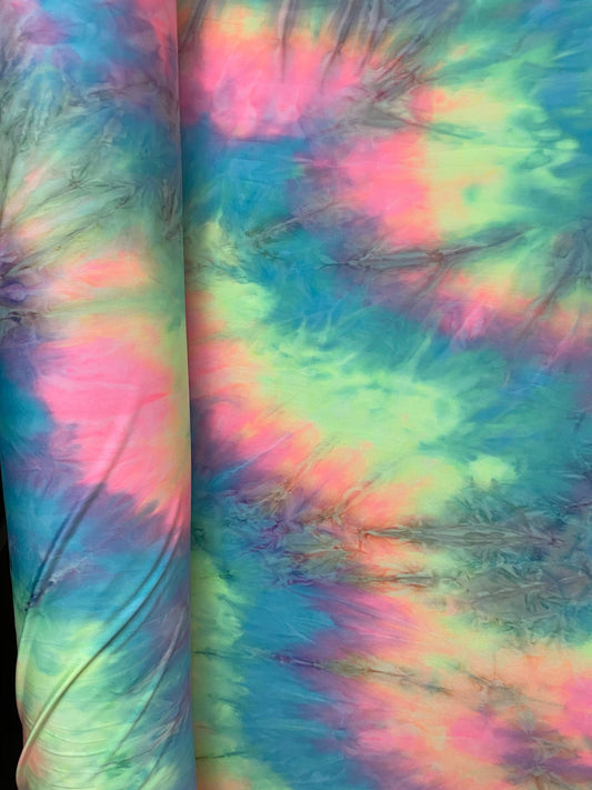 New tie dye poly spandex pastel colors 2-way stretch medium weight 58/60” Sold by the YD. Ships worldwide from Los Angeles California USA.