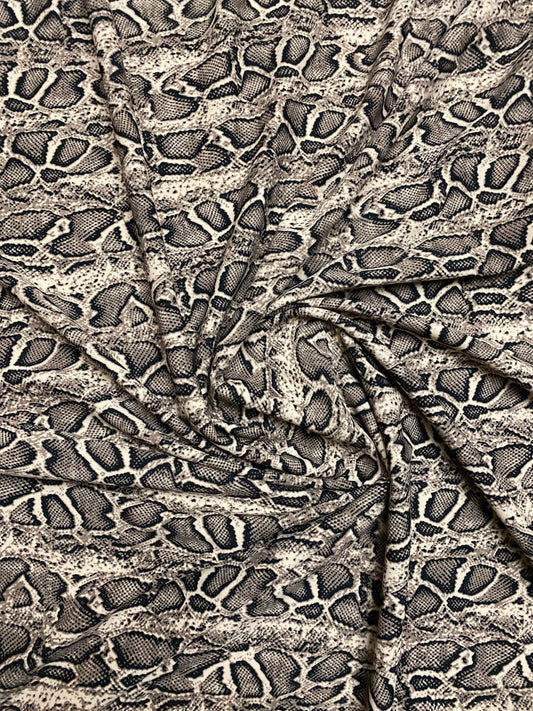 New Exotic snake design taupe/black print on great poly spandex 2-way stretch 58/60” Sold by the YD. Ships worldwide from Los Angeles CA.