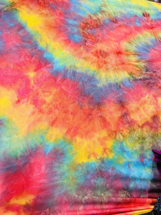 Tie dye rainbow print on great quality of poly spandex 2-way stretch 58/60” Sold by the YD. Ships worldwide from Los Angeles California USA