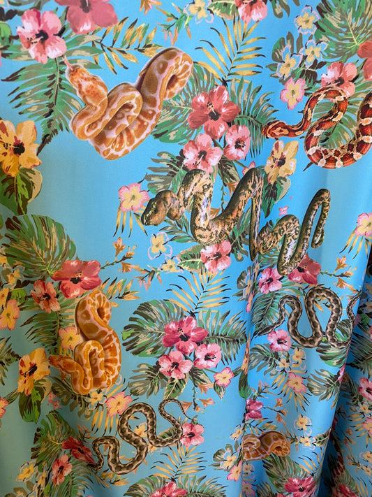 New multi exotic snake design print on poly spandex medium weight 2-way stretch 58/60” Sold by the YD. Ships worldwide from Los Angeles CA.
