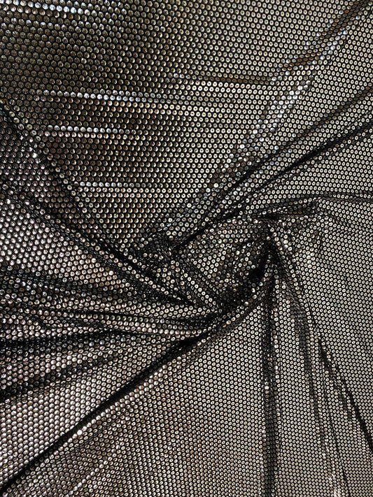 New metallic poly spandex sequins looking medium weight 4-way stretch 58/60” Sold by the YD. Ships worldwide from Los Angeles California USA