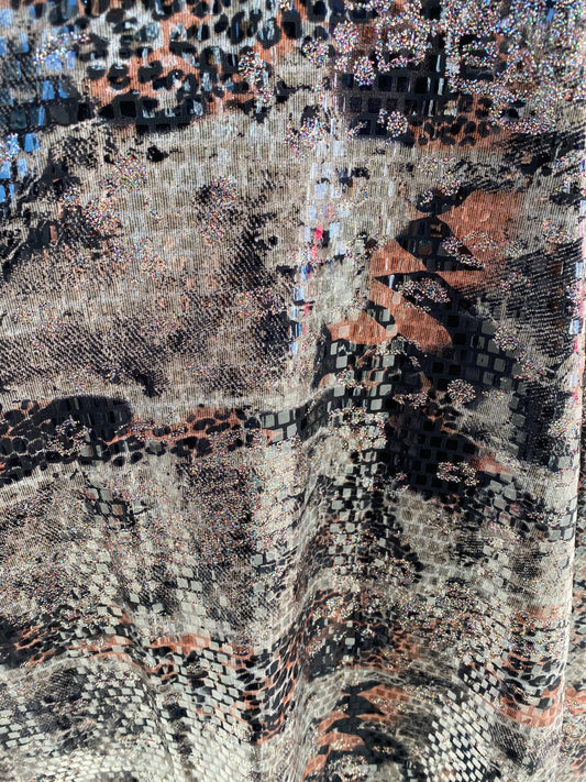 New abstract design print on poly spandex 2-way stretch with clear square sequins all over 58/60” Sold by the YD. Ships worldwide from L.A