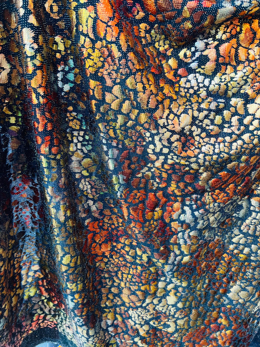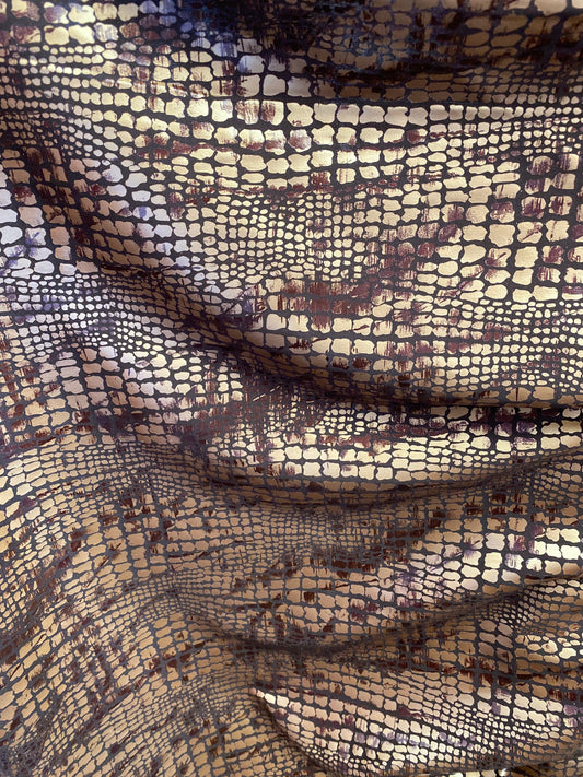 Exotic animal print design on metallic poly spandex 2-way stretch 58/60” Sold by the YD. Ships Worldwide from Los Angeles California USA.