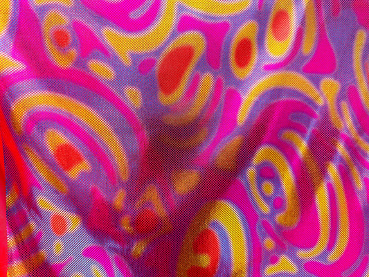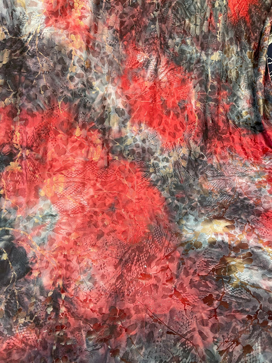 New tie dye poly spandex with foil red floral design medium weight 58/60” Sold by the YD. Ships Worldwide from Los Angeles California USA.